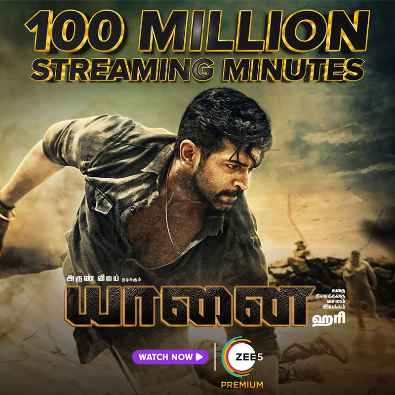 ஜீ5 தளத்தின் லேட்டஸ்ட் வெளியீடாக திரையிடப்பட்ட, இயக்குனர் ஹரி இயக்கத்தில் அருண் விஜய் நடித்திருக்கும் யானை திரைப்படம் 100 மில்லியன் பார்வை நிமிடங்களை கடந்து சாதனை படைத்து வருகிறது.