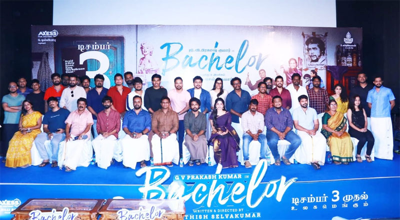 Axess Film Factory சார்பில் தயாரிப்பாளர் G.டில்லிபாபு வழங்கும், சதீஷ் செல்வகுமார் இயக்கத்தில் நடிகர் GV பிரகாஷ் நடித்துள்ள திரைப்படம, ’பேச்சிலர்’. டிரெய்லர் வெளியானபோதே, தமிழகமெங்கும் பெரும் எதிர்பார்ப்பை உண்டாக்கியுள்ள இப்படம், இக்காலத்திய இளைஞர்களின் வாழ்க்கையை தத்ரூபமாக பிரதிபலிக்கும் வகையில் உருவாகிறது. உலகமெங்கும் திரைவெளியீடாக 2021 டிசம்பர் 3 ஆம் தேதி வெளியாகும் இப்படத்தின் பத்திரிக்கை ஊடக சந்திப்பு, இன்று சென்னையில் பத்திரிக்கையாளர் முன்னிலையில் படக்குழுவினர் கலந்துகொள்ள இனிதே நடைபெற்றது.