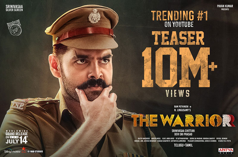லிங்குசாமி இயக்கத்தில் ராம் பொதினேனி நடிப்பில் உருவாகியிருக்கும் ‘தி வாரியர்’ படத்தின் டீசர் சமீபத்தில் வெளியாகி பெரும் வரவேற்பை பெற்றுள்ள நிலையில், டீசர் வெளியான மூன்று நாட்களில் 10 மில்லியனுக்கு அதிகமான பார்வையாளர்களை கடந்து சாதனை படைத்துள்ளது.